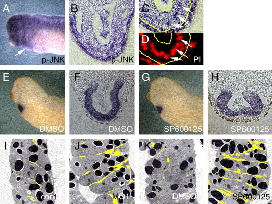 Fig. 6. Characterization of myocardial defects in Wnt11-R-depleted and JNK-inhibited embryos. (A) Whole mount immunostaining of unmanipulated st. 30 embryo showing activated JNK (p-JNK) in the heart region (arrow). (B) Transverse section through heart region of st. 30 embryo showing p-JNK-positive cells in the myocardial layer. (C) Transverse section through heart region of p-JNK-stained embryo. Arrowheads indicate regions of positive staining. (D) Nuclear staining with propidium iodide of same section shown in C illustrating the p-JNK localization is perinuclear. (EâH) Comparison of media control and JNK inhibitor (SP600125)-treated embryos at st. 33. (E and G) Whole mount in situ hybridization shows normal initiation of MHCα expression in treated and untreated embryos. (F and G) Transverse sections through the heart region of MHCα-stained embryos show that inhibition of JNK activation produces morphological defects in heart tube formation. (IâL) Transmission electron micrographs of transverse plastic sections through the myocardial wall from unmanipulated control and treated embryos at st. 33. In all panels, the endocardial side of the tube is to the right. Prominent dark spots are yolk granules. In all cases, spaces between adjacent cells have been colored in yellow. (I) Untreated control heart shows tightly packed columnar cells in myocardial wall with little space between adjacent cells. (J) Wnt11-R MO1-treated embryos show thickened wall of myocardium and increased extracellular space. (K) DMSO media-treated control hearts show very little space between adjacent cells in myocardium. (L) JNK inhibitor (SP600125)-treated embryos show increased thickness of myocardial layer and more extracellular space relative to DMSO-treated controls. Image published in: Garriock RJ et al. (2005) Copyright © 2005. Image reproduced with permission of the Publisher, Elsevier B. V.