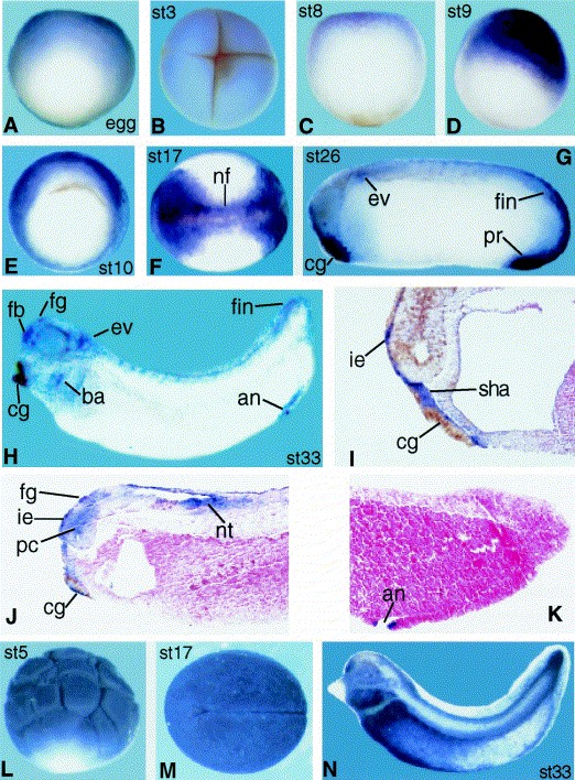 Fig. 2. Expression patterns of XODC2 (AâK) and XODC1 (LâN) by whole mount in situ hybridization. (AâC) unfertilized egg and early embryos before stage 8 showing no significant signal for XODC2. (D,E) Late blastula and gastrula embryos showing strong signal. (F,G) During neurula and early tailbud stages the expression extends to both ends of the body axis and becomes gradually restricted. (H) Stage 33 embryo showing tissue-specific expression in anus, branchial arches, the surface of the lower part of cement gland, ear vesicle, forebrain, frontal gland, and inner- and outer-fin at tail tip. (I) a mid-transversal section through the head of a stage 26 embryo, showing the expression of XODC2 in stomodeal-hypophyseal anlage, and the inner layer of epidermis of the forehead area and underneath the cement gland. (J) A mid-transversal section through the head of a late tailbud (stage 30) embryo, conforming the expression in frontal gland, prosencephalon and lower surface of cement gland, as revealed in (H); moreover, it also confirms its expression in most anterior neural tube. (K) A transversal section through the tail of a stage 33 embryo confirming the expression of XODC2 in anus. (LâN) ubiquitous expression of XODC1 in early embryogenesis. In all the figures the animal pole or dorsal is up and the anterior is left. Embryo staging was according to Nieuwkoop and Faber (1956). Abbreviations: an, anus; ba, branchial arch; cg, cement gland; ev, ear vesicle; fb, forebrain; fin, fin; fg, frontal gland; ie, inner layer of epidermis; nt, neural tube; pc, prosencephalon; pr, proctodeum; sha: stomodeal-hypophyseal anlage. Image published in: Cao Y et al. (2001) Copyright © 2001. Image reproduced with permission of the Publisher, Elsevier B. V.