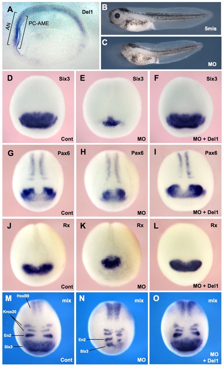 Fig. 3. Del1 is essential for the formation of anterior brain tissues. (A) Expression pattern of Del1 at the early neurula stage (sagittal section; anterior side is left). AN, anterior neuroectoderm; PC-AME, prechordal anterior mesendoderm. (B,C) Effects of animal cell injection of 5mis-MO (12.5 ng) or Del1-MO (12.5 ng) at the 8-cell stage. (D-O) Effects on expression of neural markers of animal cell injection of Del1-MO (25 ng) at the 8-cell stage (E,H,K,N). These effects were rescued by co-injecting MO-insensitive Del1 mRNA (100 pg) (F,I,L,O). Compare with controls (D,G,J,M). mix, mixed probes (Six3, En2, Krox20 and HoxB9). Image published in: Takai A et al. (2010) Copyright © 2010. Image reproduced with permission of the Publisher and the copyright holder. This is an Open Access article distributed under the terms of the Creative Commons Attribution License.