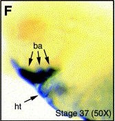 hand1 (heart and neural crest derivatives expressed 1 ) gene expression in Xenopus laevis embryo, head region, assayed via in situ hybridization, NF stage 37, lateral view, anterior left, dorsal up. This image is extracted from figure published in: Angelo S et al. (2000) Copyright © 2000. Image reproduced with permission of the Publisher, Elsevier B. V.