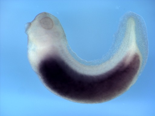 darmin (darmin) gene expression in Xenopus laevis embryo. NF stage 33 & 34, assayed via in situ hybridization, lateral view, anterior left, dorsal up.