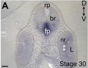slit1 (slit guidance ligand 1) gene expression in brain of Xenopus laevis embryo, assayed via in situ hybridization, NF stage 30, transverse section through head, dorsal up. This image is extracted from figure published in: Hocking JC et al. (2010) Copyright © 2010. Image reproduced with permission of the Publisher, Elsevier B. V.