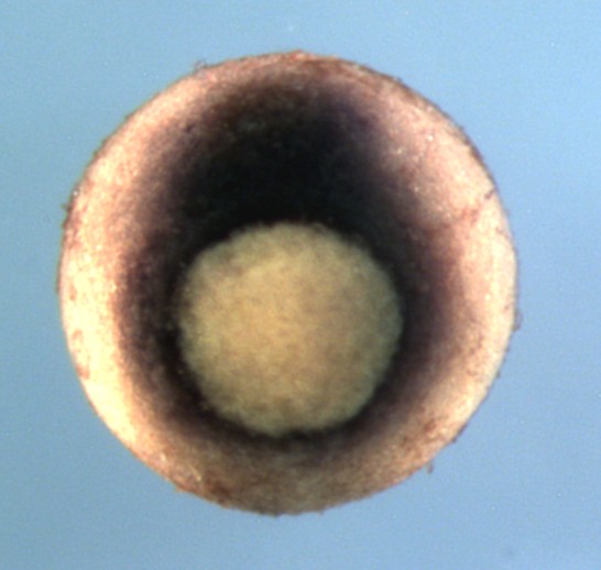 foxa1 (forkhead box A1) gene expression in a Xenopus tropicalis embryo, NF stage 11, as assayed by in situ hybridization, blastoporal view, dorsal up.