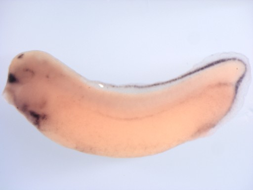 bmp2-a (bone morphogenetic protein 2) gene expression in Xenopus laevis embryo, assayed via in situ hybridization, NF stage 32, lateral view, anterior left, dorsal up.