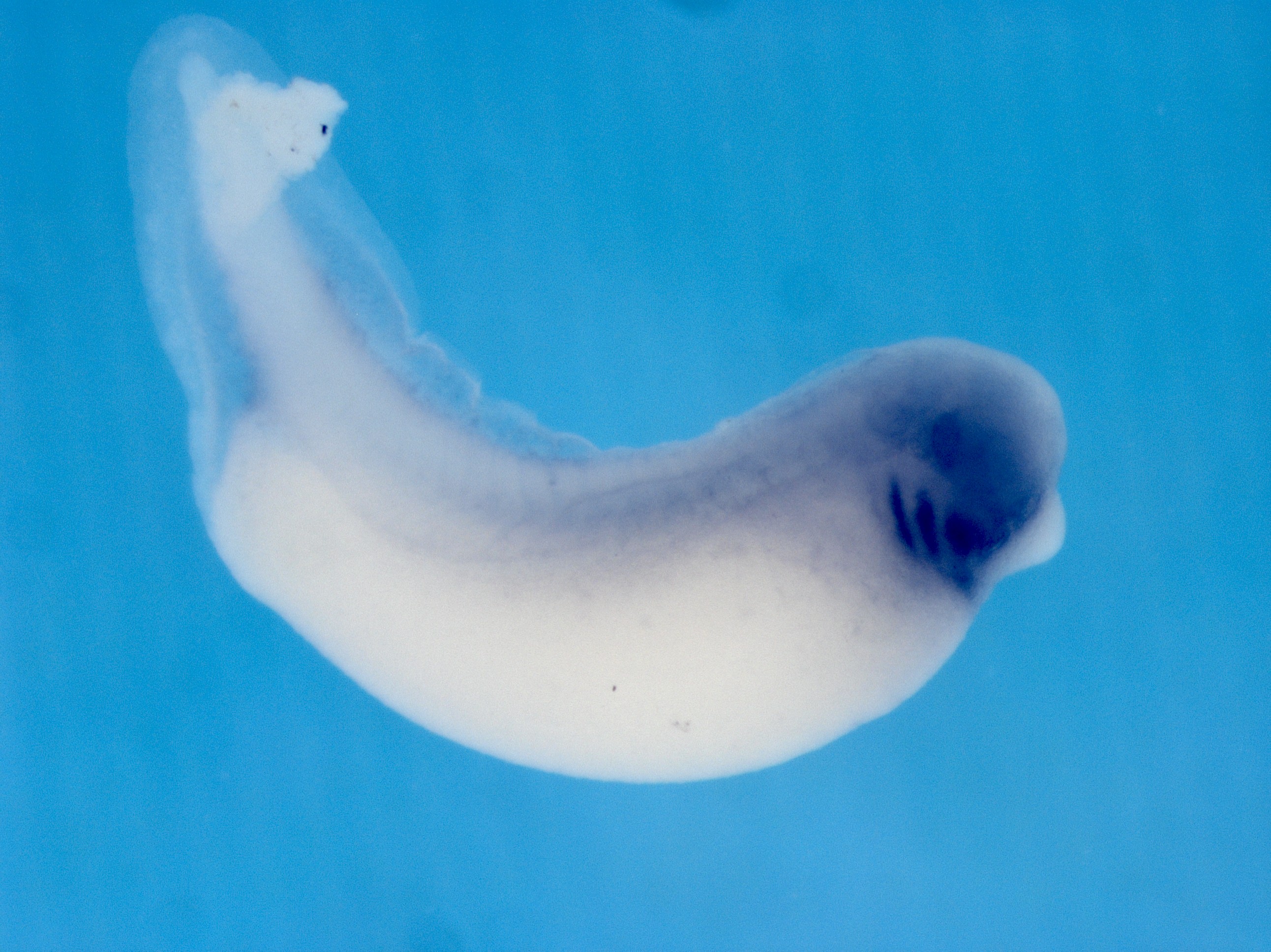 gene expression in Xenopus laevis embryo via in situ hybridization, NF stage 37&38, lateral view, anterior right.