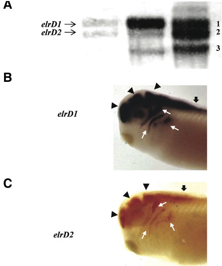 Fig. 3. Temporal and spatial expression of elrD transcripts. (A) One ïg of total RNA was reverse-transcribed and PCR performed by incorpo- rating digoxigenin-dUTP. PCR products were resolved by electrophore- sis in a 1% agarose gel and detected as described in Materials and Methods. Sequence analysis of the cloned products has shown that bands 1 and 2 correspond to elrD1 and elrD2 transcripts, respectively. Band 3 corresponds to an incomplete elongation of elrD1 and elrD2 transcripts. N: Neurula, T: Tailbud, B: Adult Brain. (B,C) In situ hybridiza- tion at tailbud stage with an antisense elrD1 (B) and elrD2 (C) probes. expression is seen in the brain vesicles (arrowheads), the cranial ganglia (arrows) and the spinal cord (block arrow). Image published in: Nassar F (2011) Copyright © 2011. Image reproduced with permission of the Publisher, University of the Basque Country Press.