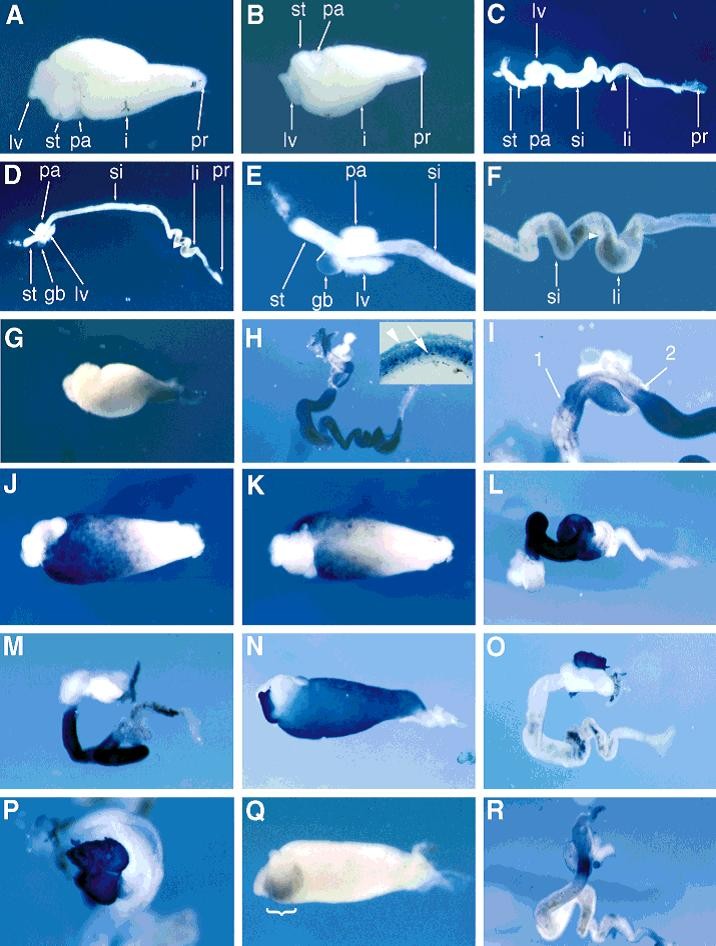 Fig. 1. Anatomy and gene expression in dissected Xenopus guts. A: Dorsal view of a gut from a 3-day-old embryo. B: Ventral view of a gut from a 3-day-old embryo. C: Gut from a 5-day-old embryo. D: Gut from a 7-day-old embryo. E: Stomach region from a 7-day-old gut. F: Boundary between small and large intestine of 7-day-old gut. G: Activity of endogenous alkaline phosphatase in 3-day gut. H: Activity of endogenous alkaline phosphatase in 7-day gut. Inset shows a section through stained gut (arrow highlights alkaline phosphatase staining (blue) in epithelium, arrowhead highlights mesodermal tissue counterstained green). I: Activity of endogenous alkaline phosphatase in stomach region of 7-day gut (1 and 2 show the first and second expression boundaries). J: Ventral view of IFABP expression in 3-day gut. K: Dorsal view of IFABP expression in 3-day gut. L: IFABP expression in 5-day gut. M: IFABP expression in 7-day gut. N: Endodermin expression in 3-day gut. O: Endodermin expression in 5-day gut. P: Endodermin expression in 5-day liver. Q: XlHbox8 expression in 3-day gut (highlighted by bracket). R: XlHbox8 expression in 7-day gut. In C-F the arrows mark the boundary between the stomach and the small intestine, and the arrowheads mark the boundary between the small intestine and the large intestine. st, stomach; si, small intestine; li, large intestine; pr, proctodeum; pa, pancreas; lv, liver; and gb, gall bladder. Image published in: Chalmers AD and Slack JM (1998) Copyright © 1998. Image reproduced with permission of the Publisher, John Wiley & Sons.