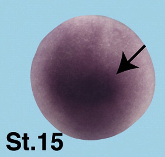 dicer1 (dicer 1, ribonuclease type III ) gene expression in Xenopus laevis embryo, via in situ hybridization, NF stage 15, anterior view, dorsal up. This image is extracted from figure published in: Gessert S et al. (2010), Image published in: Gessert S et al. (2010) Copyright © 2010. Image reproduced with permission of the Publisher, Elsevier B. V.