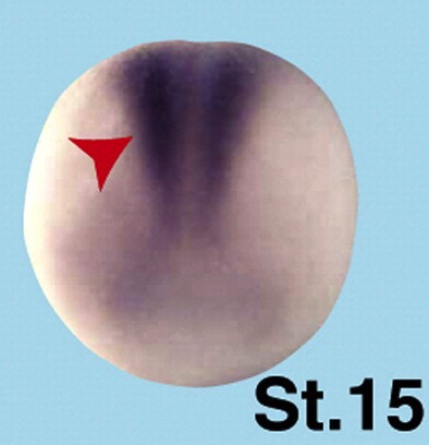 fxr1 (FMR1 autosomal homolog 1) gene expression in Xenopus laevis embryo via in situ hybridization, NF stage 15, anterior view, dorsal up. This image is extracted from figure published in: Gessert S et al. (2010), Image published in: Gessert S et al. (2010) Copyright © 2010. Image reproduced with permission of the Publisher, Elsevier B. V.