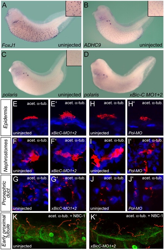 Fig. 6. Bicaudal-C and cilia formation. (AâD) Whole mount in situ hybridization of uninjected (AâC) or xBic-C-MO1 + 2-injected Xenopus embryos (D) at stage 36 using (A) FoxJ1, (B) Axonemal Dynein Heavy Chain 9 (ADHC9) and (C, D) polaris. (EâJâ²) Immunocytochemistry using anti-acetylated α-tubulin antibody (red) on uninjected control, xBic-C-MO1 + 2 and xPol-MO-injected embryos at stage 42. (E, Eâ², H, Hâ²) Ciliated cells of the epidermis; (F, Fâ², I, Iâ²) cilia of the nephrostomes; (G, Gâ², J, Jâ²) individual primary cilia present on the cells of the pronephric duct. (K, Kâ²) Immunocytochemistry using anti-acetylated α-tubulin (red) and anti-NBC1 (green) antibodies on uninjected control and xBic-C-MO1 + 2-injected embryos at stage 42. Images were obtained by confocal microscopy; nuclei were counterstained with DAPI (blue). Image published in: Tran U et al. (2007) Copyright © 2007. Image reproduced with permission of the Publisher, Elsevier B. V.