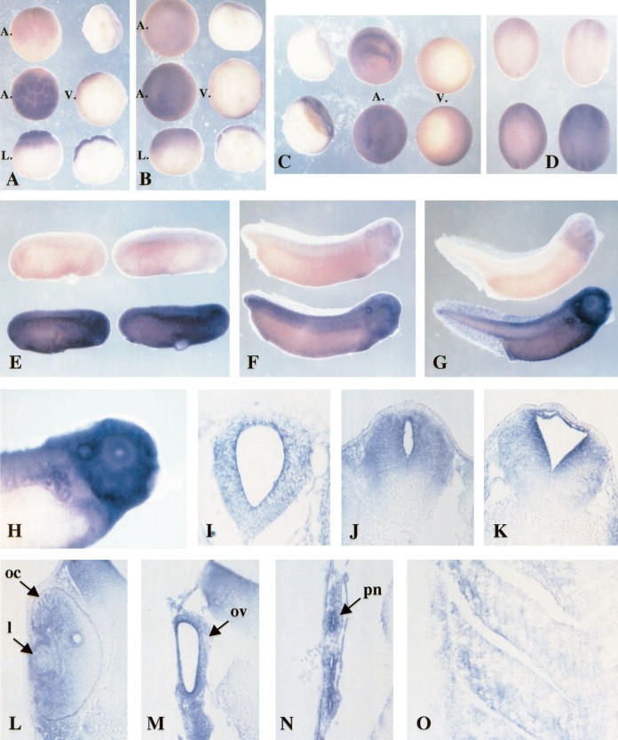 embryogenesis (A, stage 61/2; B, stage 9; C, stage 101/2; D, stages 13 (left) and 17 (right); E, stages 23 (left) and 25 (right); F, stage 32; G, stage 37). Control: