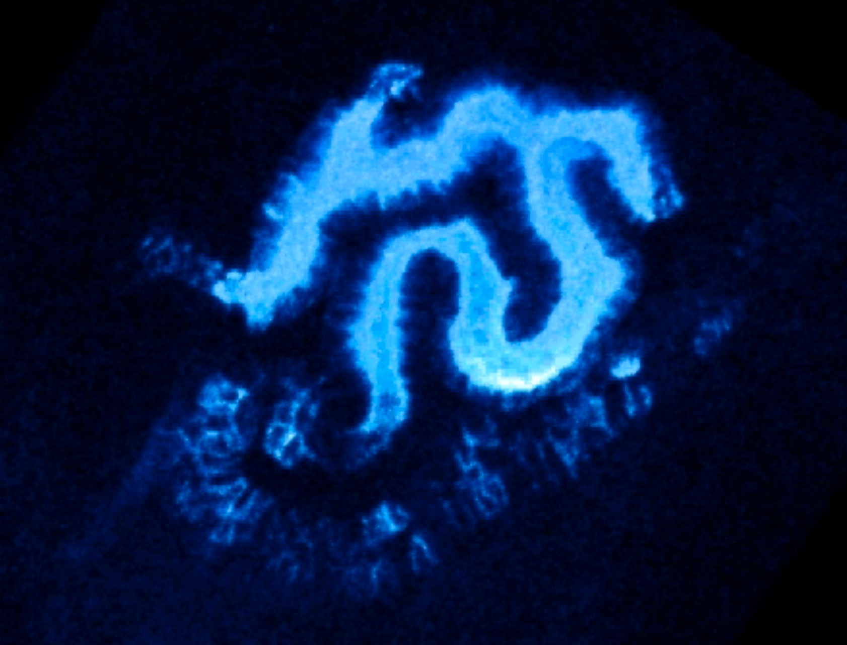 Image by Nareesa Ali. This sample was stained with both 3G8 and 4A6, but at this stage only a few scattered cells in the distal segment and duct are 4A6 positive. 3G8 staining lines the inner surface of the proximal tubules of the pronephric nephron, sometimes extending a short distance from the apical membrane- presumably to the tight junctions. Staining never extends to the lateral membrane. There is faint staining in two of the three nephrostomes visible, the third nephrostome (on the right) may also be stained but is covered by the posterior arm of the pronephric tubules. This image is a frame grab from a 3D stack collected on a confocal. Approximately stage 38. Image created by: Vize Lab Larger Image Printer Friendly View |
