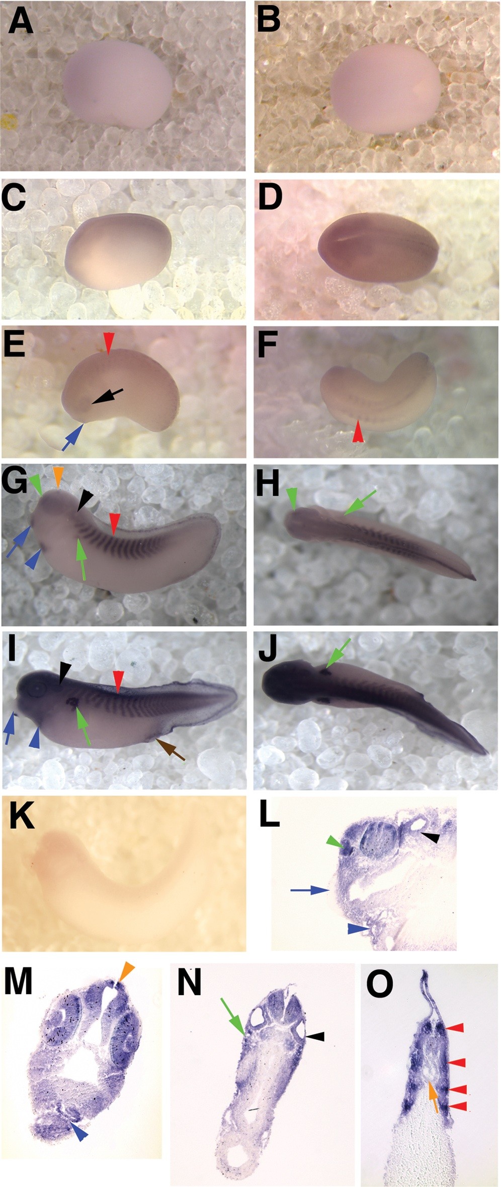 Shown are in situ hybridization results depicting expression of xNocturnin mRNA. All embryos in this figure are shown with the anterior facing left. Side views of the embryos are depicted in panels A,C,E,G,I, and K and dorsal views in panels B,D,F, H, and J. Low levels of xNocturnin were first detected in the neural plate of stage 15/16 embryos A and B. C and D show neural plate staining in a stage 18 embryo. E and F show a neural tube stage embryo (stage 24) with xNocturnin expression in the eyes (black arrow), somites (red arrowhead), and cement gland (blue arrow). G and H show early tailbud stage embryos with staining in the otic vesicle (black arrowhead), pronephric tubules (green arrow), heart (blue arrowhead), olfactory pit (green arrowhead), pineal (orange arrowhead), cement gland (blue arrow) and somites (red arrowhead). Late tailbud stages (I and J; stage 39) show similar results but additional staining in the anus/blastopore (brown arrow) and cement gland staining is absent (blue arrow). Sagittal (L) and transverse sections (M) of late tailbud embryos confirm xNocturnin expression in the brain, retina and lens (M), otic vesicle (N, black arrowhead), olfactory pit (L, green arrow), pronephric tubules (N, green arrow), heart (M, blue arrowhead), notochord (O, orange arrow) and in the somites (O, red arrowheads). xNocturnin is absent from the cement gland at late tailbud stages (L, blue arrow). No expression was seen using a sense probe specific to Nocturnin (K). Image published in: Curran KL et al. (2008) Curran et al. Creative Commons Attribution license