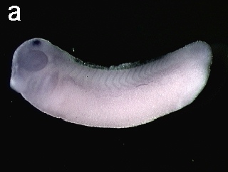 axin1 (axin1) gene expression in Xenopus laevis embryos, NF stage 28, as assayed by in situ hybridization, lateral view, anterior left, dorsal up. This image is extracted from figure published in: Hedgepeth CM et al. (1999), Image published in: Hedgepeth CM et al. (1999) Copyright © 1999. Image reproduced with permission of the Publisher, Elsevier B. V.