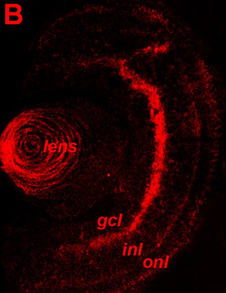 Vamp2 Ab1 staining in Xenopus laevis NF stage 40 eye This image is extracted from figure published in: Marshak S et al. (2012), Image published in: Marshak S et al. (2012) Marshak et al. Creative Commons Attribution license
