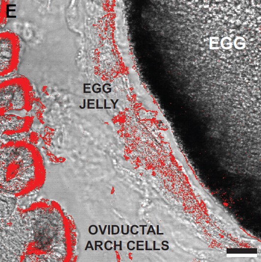 crisp3 (cysteine-rich secretory protein 3) gene expression in sections of Xenopus laevis adult oviduct, NF stage 66, as assayed by immunohistochemistry. Red immunofluorescence is superimposed on bright field image. This image is extracted from figure published in: Burnett LA et al. (2008), Image published in: Burnett LA et al. (2008) Copyright © 2008. Image reproduced with permission of the Publisher, University of the Basque Country Press.
