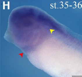 kidins220 (kinase D-interacting substrate, 220kDa) gene expression in Xenopus laevis embryo, assayed via in situ hybridization, NF stage 35 & 36, lateral view, anterior left, dorsal up. This image is extracted from figure published in: Marracci S et al. (2013), Image published in: Marracci S et al. (2013) Copyright © 2013. Image reproduced with permission of the Publisher, University of the Basque Country Press.
