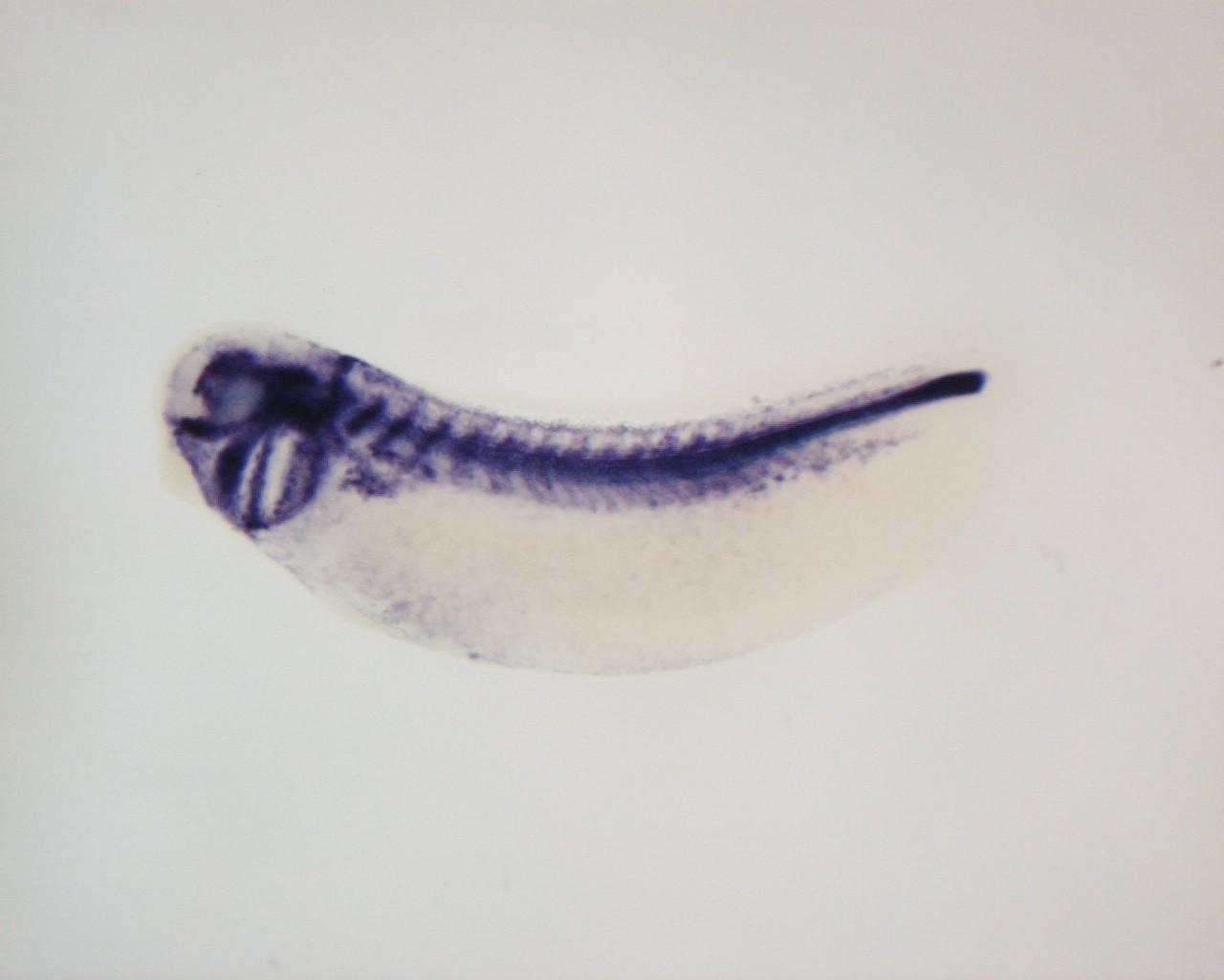 angptl2 (angiopoietin-like 2) gene expression in Xenopus laevis embryo, assayed via in situ hybridization, NF stage 29 & 30, lateral view, anterior left, dorsal up. Copyright © Patient Lab