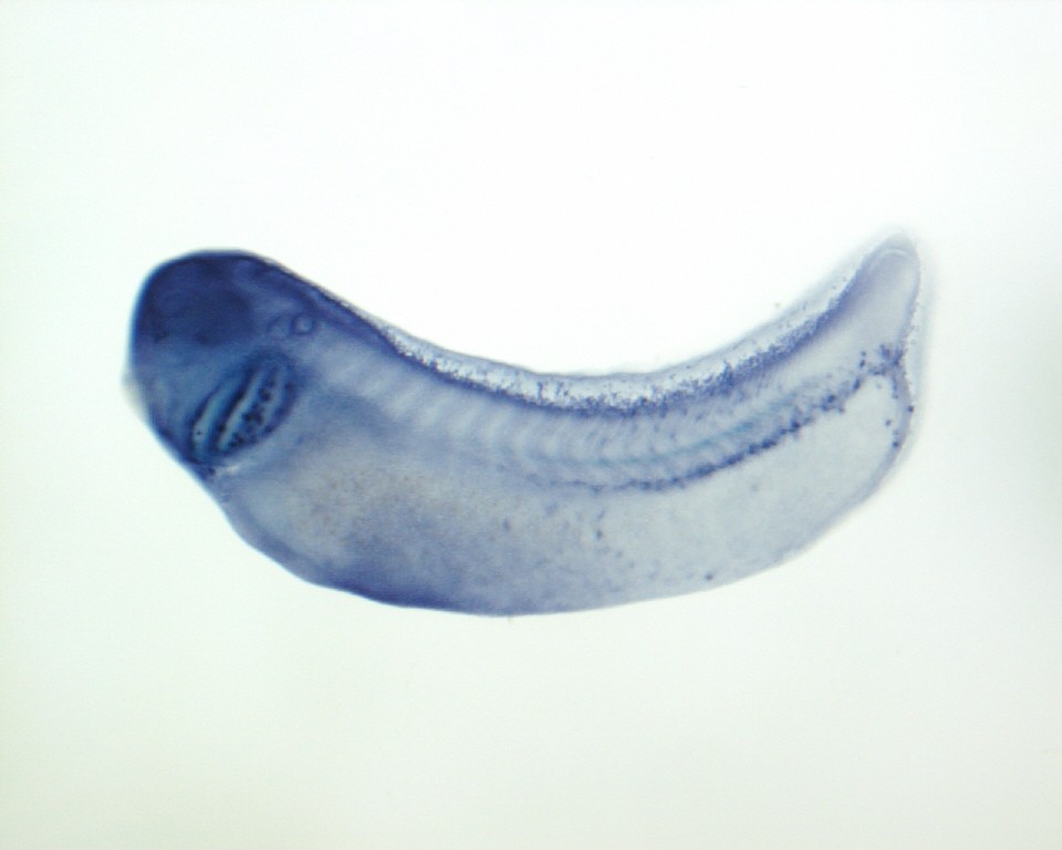 aqp1 (aquaporin 1 (Colton blood group)) gene expression in Xenopus laevis embryo, assayed via in situ hybridization, NF stage 32 lateral view, anterior left, dorsal up. Copyright © Patient Lab