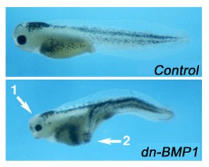Our current research has focussed on the roles of two gene families in regulating early Xenopus development: the Tolloid family of metalloproteases and the large family of G-protein coupled receptors (GPCRs) . Tolloid Metalloproteases : The Tolloid family of secreted metalloproteases are homologues of the Drosophila tolloid gene, which is required for dorsal-ventral patterning during the blastoderm stage of embryogenesis. In Xenopus, the three homologues that have so far been described are called BMP1 (a longer splice variant is usually called Tolloid), Xolloid, and Xolloid-related. All three genes are expressed during gastrulation where they appear to regulate the activity of BMP4, an extracellular signalling molecule that plays a central role in dorsal-ventral patterning. High concentrations of BMP4 specify ventral fates and low concentrations specify lateral fates, while dorsal fates require an absence of BMP. Tolloid metalloproteases regulate BMP4 signalling by cleaving Chordin, an inhibitory binding protein for BMP4 that is synthesised in the dorsal mesoderm of Xenopus gastrulae. Chordin that has been cleaved by Tolloids has a greatly reduced affinity for BMP4. While BMP1and Xolloid are widely distributed in Xenopus gastrulae, Xolloid-related is localised to ventral and lateral sectors of mesoderm suggesting that it could be the more important of the three in regulating Chordin. In addition to regulating Chordin, these proteases are also required to cleave components of the extracellular matrix, including the main fibrillar Collagens. The number of substrates known to be cleaved by these proteases continues to increase and a general theme is that they generate the mature protein from longer precursors.Current Members