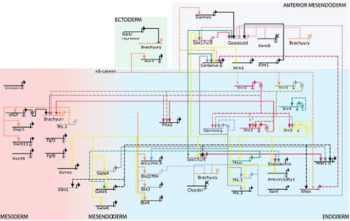 Development is a consequence of the ordered division of cells to form a whole organism. This process is controlled by signals and transcription factors that interact with one another to regulate the fate of individual cells. These interactions, when viewed as a whole, form a genetic regulatory network. I am exploring ways to identify, model, test and represent such networks to understand how transcription factors and signals work together to control development. My lab is interested in the process of development and, ultimately, how cells are programmed to different phenotypes. We investigate these processes using a variety of approaches, including in vivo, in vitro and in silico methods. For information on compiling gene regulatory networks and to find out more about the tools we have developed, visit the 'Genetic Regulatory Network' pages or visit www.myGRN.org . An excellent and comprehensive review has ercently been published by Thomas Schlitt and Alvis Brazma - details available here. Mesendoderm specification in amphibians. The process of germ layer specification in Xenopus laevis has been extensively studied and a detailed picture describing the underlying genetic regulatory events is emerging. In part, this is a result of our work to deduce a GRN describing the specification of mesoderm and endoderm during early development ( Loose and Patient, 2004). This network, although incomplete as not all interactions have yet been experimentally verified, already appears highly complex (see below).