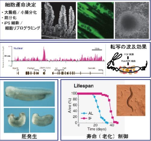 Laboratory of Signal Transduction We are interested in identifying and elucidating molecular mechanisms that regulate cell proliferation, cell differentiation, cell cycle, aging and developmental processes. The current topics include 1) regulatory mechanisms and functions of the MAP kinase cascade pathways, 2) identification of novel signal transduction mechanisms, 3) molecular mechanisms for life span regulation, 4) roles of protein kinases in cell cycle progression and regulation, 5) growth factor signaling mechanisms in developmental processes, 6) regulatory mechanisms for mammalian circadian clock.