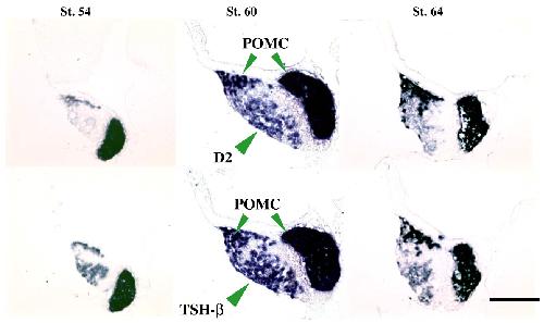 Timing of metamorphosis and the onset of the negative feedback loop between the thyroid gland and the pituitary is controlled by type II iodothyronine deiodinase in Xenopus laevis. , Huang H, Cai L, Remo BF, Brown DD ., Proc Natl Acad Sci U S A. June 19, 2001; 98 (13): 7348-53.