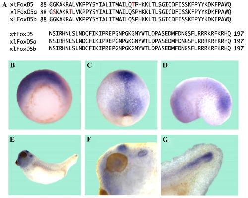 Sequence and expression of FoxB2 ( XFD-5) and FoxI1c ( XFD-10) in Xenopus embryogenesis. , Pohl BS, Knöchel S, Dillinger K , Knöchel W ., Mech Dev. September 1, 2002; 117 (1-2): 283-7.