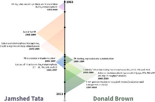 Molecular and genetic studies on the signaling and the regulation of amphibian metamorphosis by thyroid hormone, the contribution of Jamshed Tata and Donald Brown. , Nashed S, Louis E, Buisine N , Sachs LM ., Dev Biol. May 25, 2026; 533 181-188.