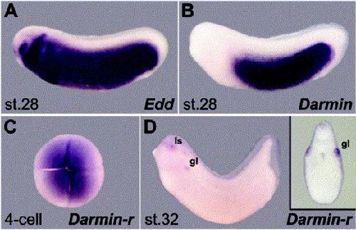 Darmin is a novel secreted protein expressed during endoderm development in Xenopus. , Pera EM , Martinez SL, Flanagan JJ, Brechner M, Wessely O , De Robertis EM ., Gene Expr Patterns. May 1, 2003; 3 (2): 147-52.