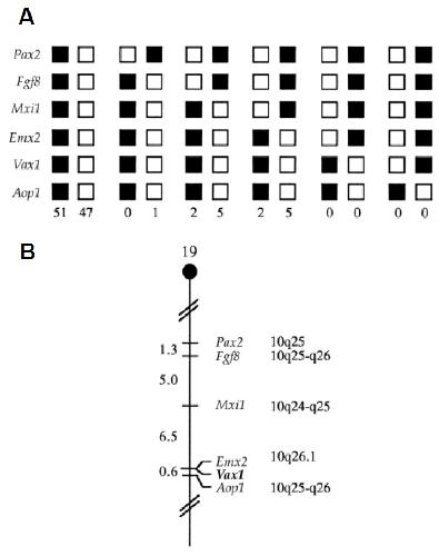 Vax1 is a novel homeobox-containing gene expressed in the developing anterior ventral forebrain., Hallonet M, Hollemann T, Wehr R, Jenkins NA, Copeland NG, Pieler T, Gruss P., Development. July 1, 1998; 125 (14): 2599-610.