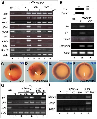 mNanog possesses dorsal mesoderm-inducing ability by modulating both BMP and Activin/ nodal signaling in Xenopus ectodermal cells. , Miyazaki A, Ishii K, Yamashita S, Nejigane S, Matsukawa S, Ito Y, Onuma Y , Asashima M , Michiue T ., PLoS One. January 1, 2012; 7 (10): e46630.