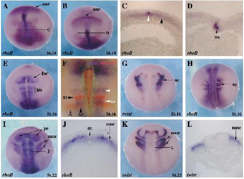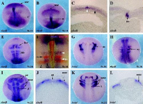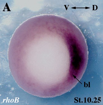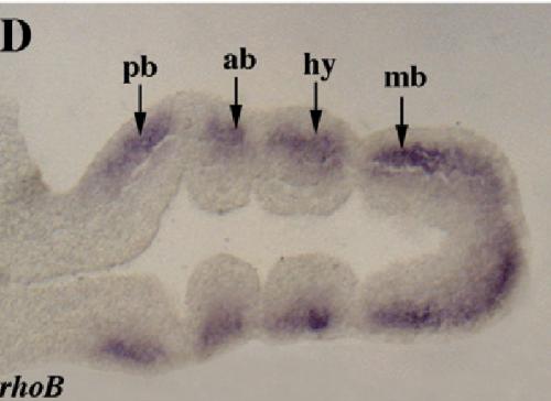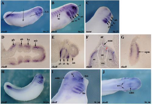 Expression of RhoB in the developing Xenopus laevis embryo., Vignal E, de Santa Barbara P, Guémar L, Donnay JM, Fort P, Faure S., Gene Expr Patterns. January 1, 2007; 7 (3): 282-8.