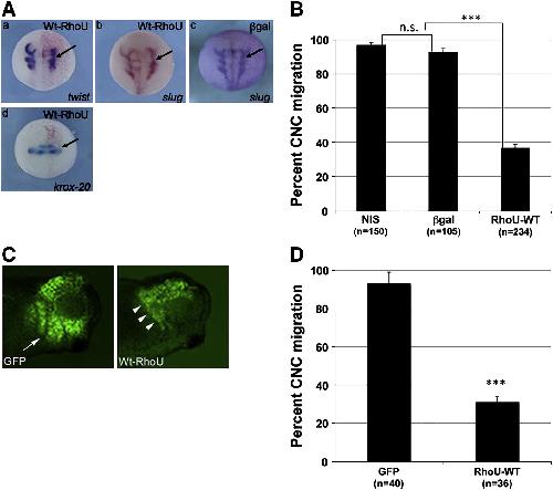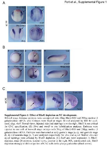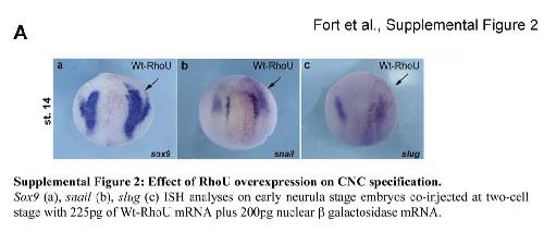 Activity of the RhoU/Wrch1 GTPase is critical for cranial neural crest cell migration., Fort P, Guémar L, Vignal E, Morin N, Notarnicola C, de Santa Barbara P, Faure S., Dev Biol. February 15, 2011; 350 (2): 451-63.