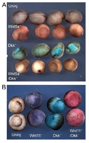 Wnt5a and Wnt11 interact in a maternal Dkk1-regulated fashion to activate both canonical and non-canonical signaling in Xenopus axis formation. , Cha SW , Tadjuidje E , Tao Q , Wylie C , Heasman J ., Development. November 1, 2008; 135 (22): 3719-29.