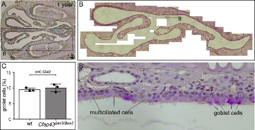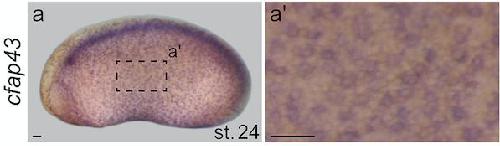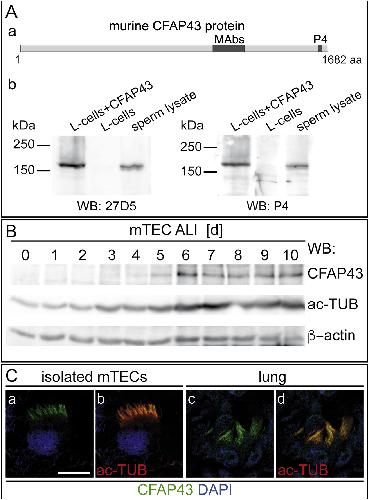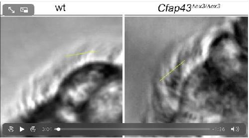 CFAP43 modulates ciliary beating in mouse and Xenopus., Rachev E, Schuster-Gossler K, Fuhl F, Ott T, Tveriakhina L, Beckers A, Hegermann J, Boldt K, Mai M, Kremmer E, Ueffing M, Blum M, Gossler A., Dev Biol. March 15, 2020; 459 (2): 109-125.