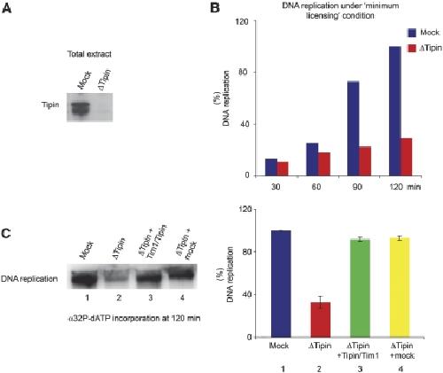 Tipin is required for stalled replication forks to resume DNA replication after removal of aphidicolin in Xenopus egg extracts. , Errico A, Costanzo V, Hunt T ., Proc Natl Acad Sci U S A. September 18, 2007; 104 (38): 14929-34.