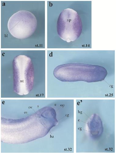 Expression zones of three novel genes abut the developing anterior neural plate of Xenopus embryo., Novoselov VV, Alexandrova EM, Ermakova GV, Zaraisky AG., Gene Expr Patterns. May 1, 2003; 3 (2): 225-30. |
