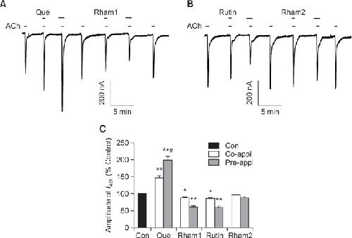 Differential Effects of Quercetin and Quercetin Glycosides on Human α7 Nicotinic Acetylcholine Receptor-Mediated Ion Currents. , Lee BH, Choi SH, Kim HJ , Jung SW, Hwang SH, Pyo MK, Rhim H, Kim HC , Kim HK , Lee SM, Nah SY., Biomol Ther (Seoul). July 1, 2016; 24 (4): 410-7.