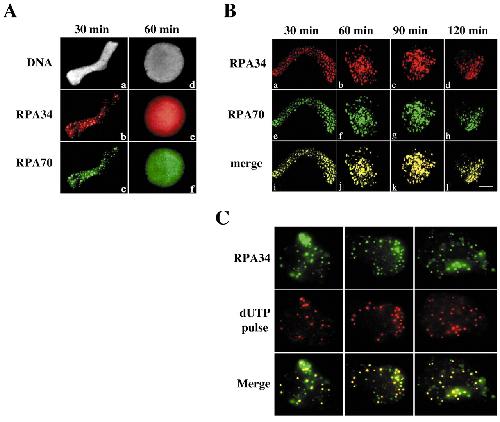 A hypophosphorylated form of RPA34 is a specific component of pre-replication centers., Françon P, Lemaître JM, Dreyer C, Maiorano D, Cuvier O, Méchali M., J Cell Sci. October 1, 2004; 117 (Pt 21): 4909-20. |