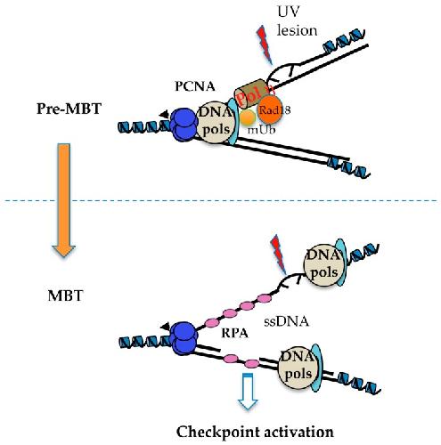 Implication of RPA32 phosphorylation in S-phase checkpoint signalling at replication forks stalled with aphidicolin in Xenopus egg extracts., Recolin B, Maiorano D., Biochem Biophys Res Commun. November 2, 2012; 427 (4): 785-9. |