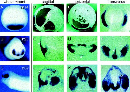 Cloning and expression of xSix3, the Xenopus homologue of murine Six3. , Zhou X , Hollemann T , Pieler T , Gruss P., Mech Dev. March 1, 2000; 91 (1-2): 327-30.