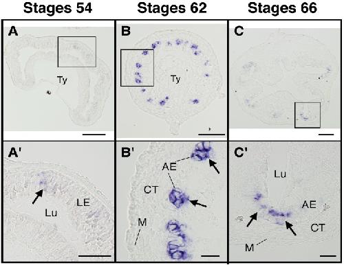 Expression profiling of intestinal tissues implicates tissue-specific genes and pathways essential for thyroid hormone-induced adult stem cell development. , Sun G , Heimeier RA, Fu L, Hasebe T , Das B, Ishizuya-Oka A , Shi YB ., Endocrinology. November 1, 2013; 154 (11): 4396-407.