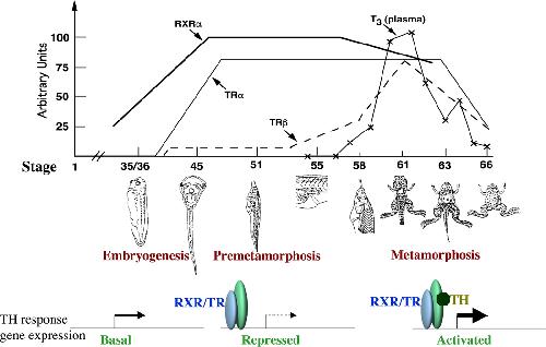 Molecular and genetic studies suggest that thyroid hormone receptor is both necessary and sufficient to mediate the developmental effects of thyroid hormone. , Das B, Matsuda H, Fujimoto K , Sun G , Matsuura K, Shi YB ., Gen Comp Endocrinol. September 1, 2010; 168 (2): 174-80.