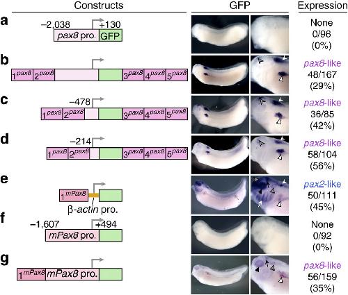 Evolution of a tissue-specific silencer underlies divergence in the expression of pax2 and pax8 paralogues. , Ochi H , Tamai T, Nagano H, Kawaguchi A, Sudou N , Ogino H ., Nat Commun. May 22, 2012; 3 848.