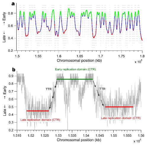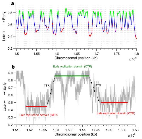 DNA replication timing is deterministic at the level of chromosomal domains but stochastic at the level of replicons in Xenopus egg extracts. , Labit H, Perewoska I, Germe T, Hyrien O , Marheineke K ., Nucleic Acids Res. October 1, 2008; 36 (17): 5623-34.