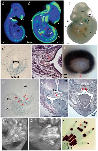 Loss of the BMP antagonist, SMOC-1, causes Ophthalmo-acromelic (Waardenburg Anophthalmia) syndrome in humans and mice., Rainger J, van Beusekom E, Ramsay JK, McKie L, Al-Gazali L, Pallotta R, Saponari A, Branney P, Fisher M, Morrison H, Bicknell L, Gautier P, Perry P, Sokhi K, Sexton D, Bardakjian TM, Schneider AS, Elcioglu N, Ozkinay F, Koenig R, Mégarbané A, Semerci CN, Khan A, Zafar S, Hennekam R, Sousa SB, Ramos L, Garavelli L, Furga AS, Wischmeijer A, Jackson IJ, Gillessen-Kaesbach G, Brunner HG, Wieczorek D, van Bokhoven H, Fitzpatrick DR., PLoS Genet. July 1, 2011; 7 (7): e1002114. |