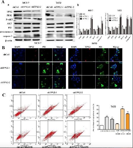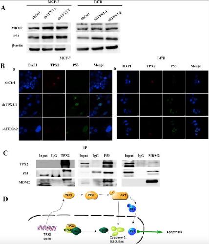 Targeting TPX2 suppresses proliferation and promotes apoptosis via repression of the PI3k/AKT/P21 signaling pathway and activation of p53 pathway in breast cancer., Chen M, Zhang H, Zhang G, Zhong A, Ma Q, Kai J, Tong Y, Xie S, Wang Y, Zheng H, Guo L, Lu R., Biochem Biophys Res Commun. December 9, 2018; 507 (1-4): 74-82.