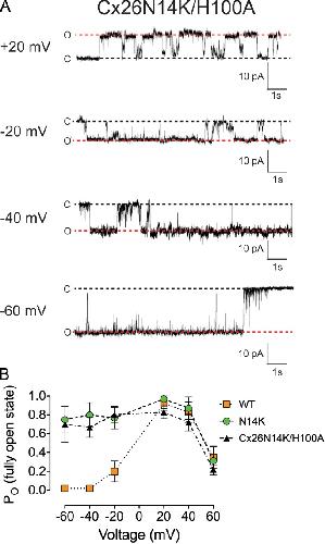 The connexin26 human mutation N14K disrupts cytosolic intersubunit interactions and promotes channel opening., Valdez Capuccino JM, Chatterjee P, García IE, Botello-Smith WM, Zhang H, Harris AL, Luo Y, Contreras JE., J Gen Physiol. March 4, 2019; 151 (3): 328-341.