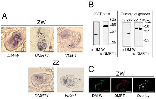 Opposite roles of DMRT1 and its W-linked paralogue, DM-W, in sexual dimorphism of Xenopus laevis: implications of a ZZ/ZW-type sex-determining system. , Yoshimoto S, Ikeda N, Izutsu Y , Shiba T, Takamatsu N, Ito M., Development. August 1, 2010; 137 (15): 2519-26.